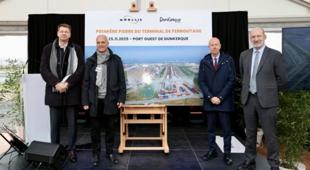 Maurice GEORGES, Président du Directoire de Dunkerque-Port, Bernard MEÏ, Président du Groupe MODALIS, Patrice VERGRIETE, ancien ministre, Maire de Dunkerque et Président de la CUD, et Frédéric LOISEAU, Sous-préfet de Dunkerque, ont posé aujourd’hui la première pierre du terminal de ferroutage de Dunkerque.